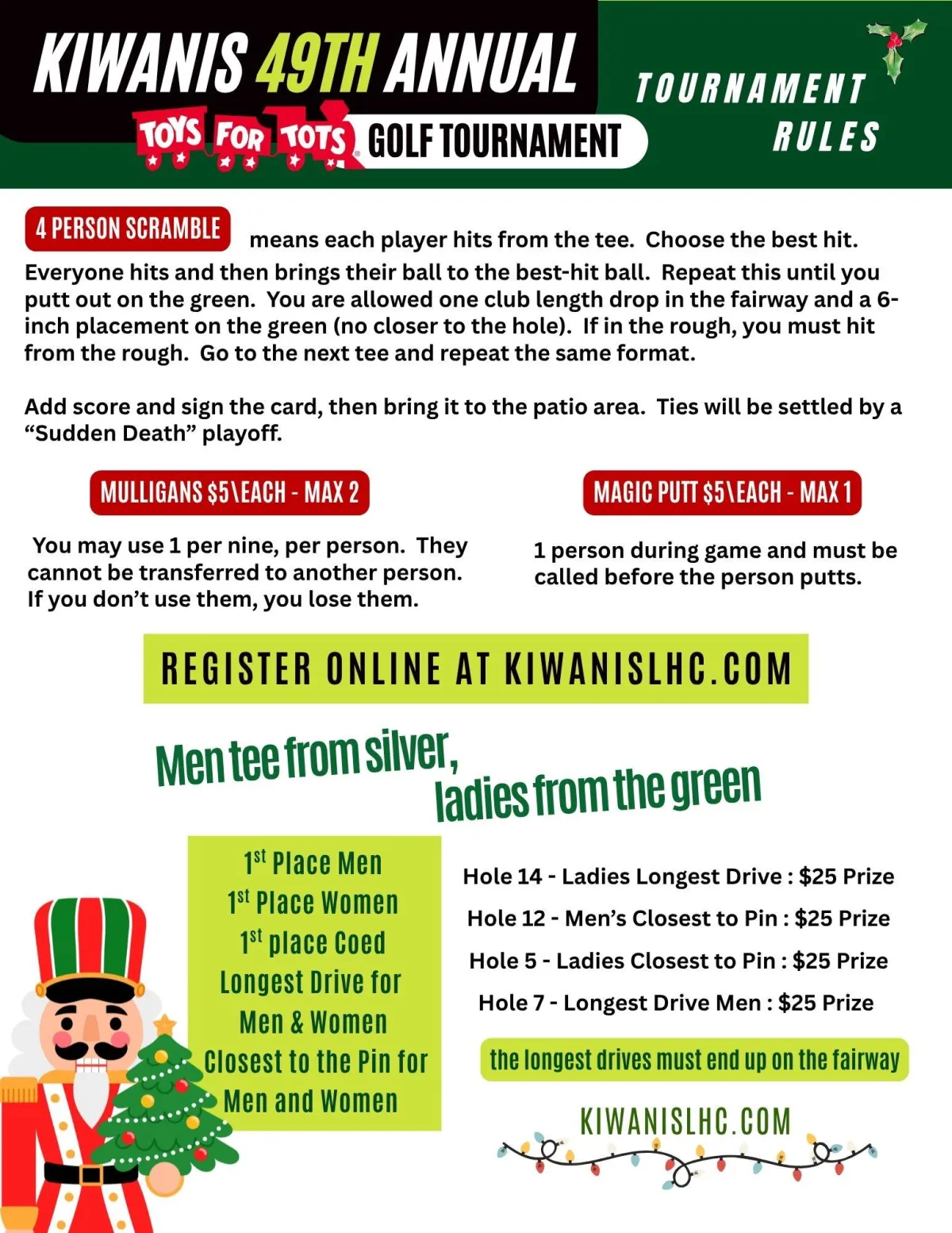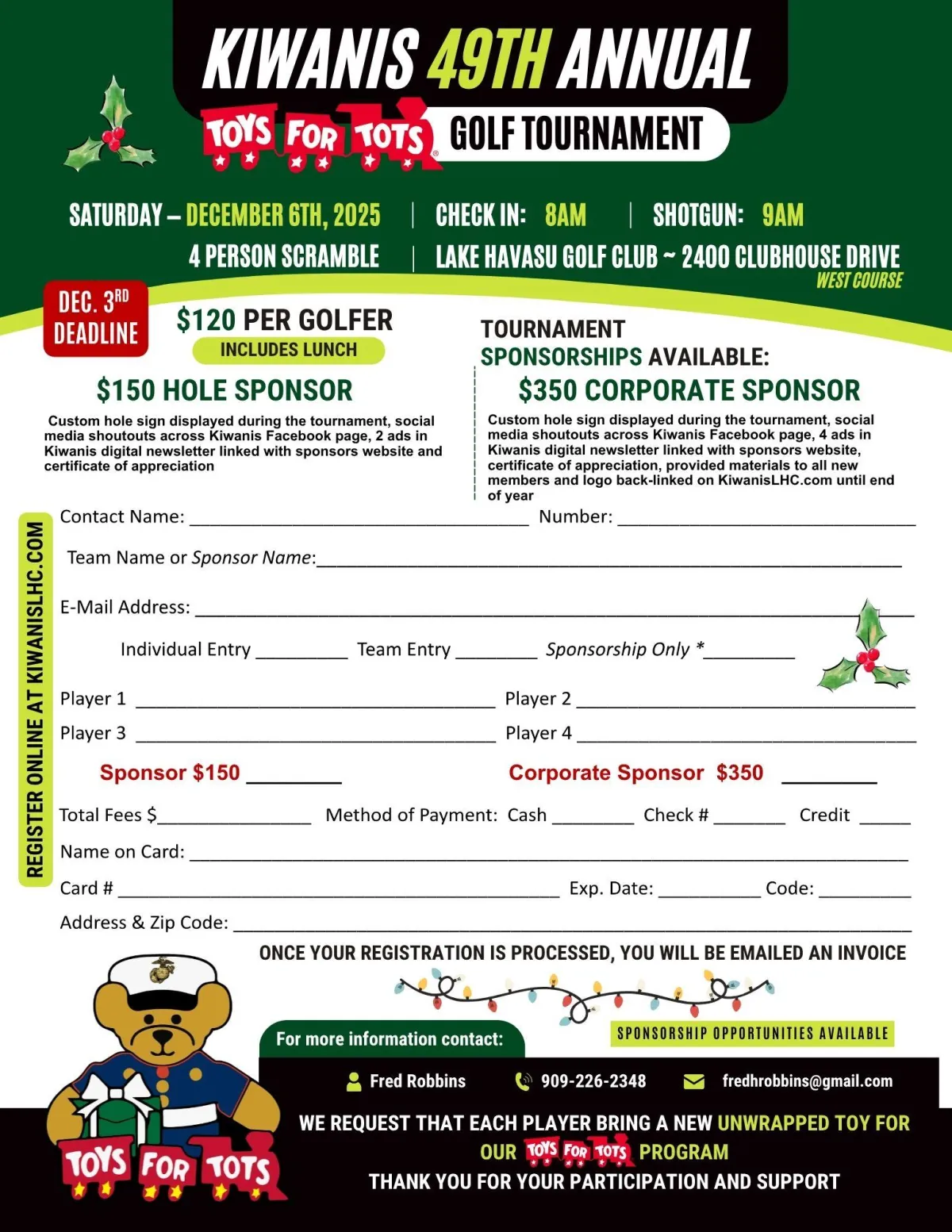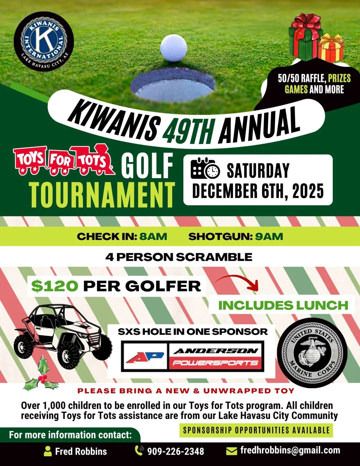 The Kiwanis of Lake Havasu City invites you to tee up for a cause at our 49th Annual Toys for Tots Golf Tournament, happening Saturday, December 6th, 2025, at Lake Havasu Golf Club. This annual holiday tradition brings golfers, businesses, and community members together to make a meaningful impact — helping ensure that every child in Lake Havasu City experiences the joy of the season.