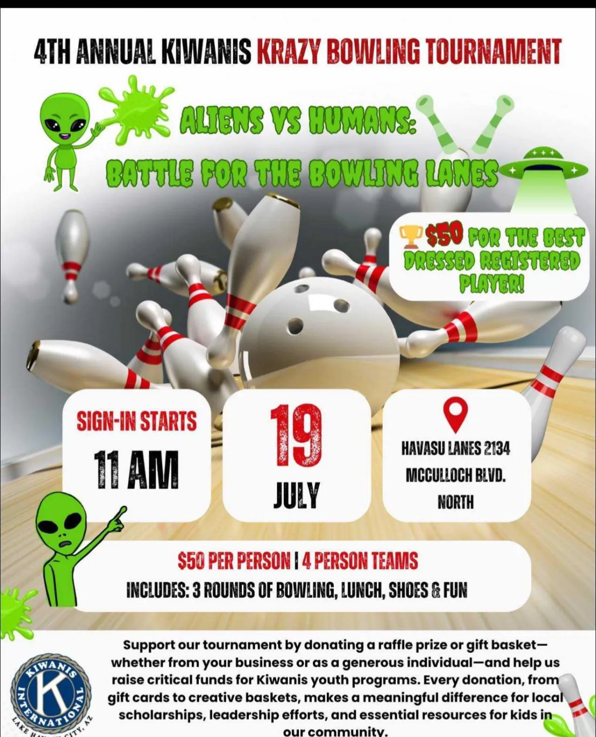 The Kiwanis of Lake Havasu City extends our deepest gratitude to our 2025 Corporate Sponsors — ABCO Builders, KelliWallin.com, and Quality Comfort Heating & Air — for their incredible support of our 4th Annual Kiwanis Krazy Bowling Tournament.